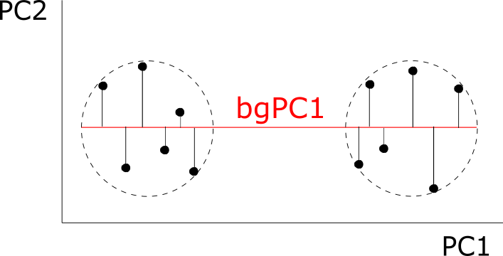 Imagine one population (black), where you run a PCA so you get a visualization like this (PC1 & PC2). If you make two groups out of your population (dashed circles) and you run a PCA on the means you will get just one axis (bgPC1, N-1) , that connects the centre of each circle. Finally, each individual would be projected on this new axis to get the between-group PCA scores.