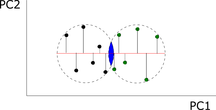 In the second case, however, within-group variation is perpendicular to among-group variation. On the extreme, within-group would be represented by two lines perpendicular to the bgPC1 (red line). In that situation the projection of the individuals on the new axis would completely remove within-group variation and it would also reduce (but comparatively much less) variation among individuals from the two groups.