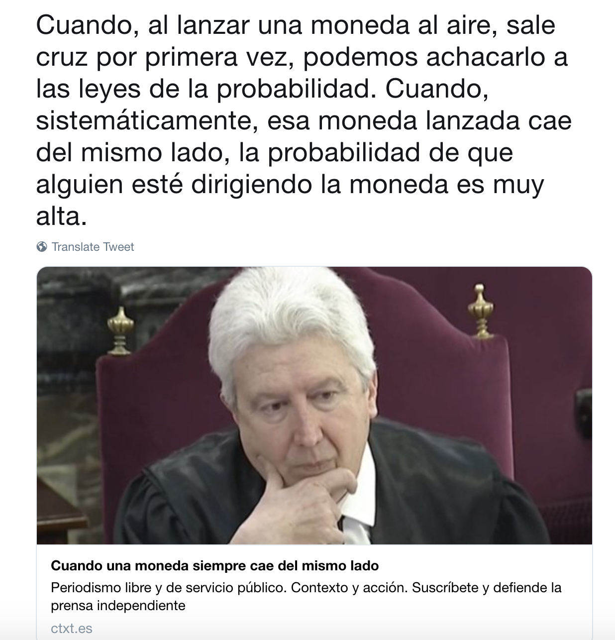 Encuentro este artículo en Twitter, escrito por un señor con muchos seguidores. Habla sobre el juicio del procés, lo titula ‘Cuando una moneda siempre cae del mismo lado’ y en el texto incluye ese parrafito que veis. ¿Se parece a lo que acabo de explicar, verdad? Cuando un p-valor es muy bajo, cuando la probabilidad de que algo haya ocurrido al azar es muy baja, debe de haber un mecanismo de interés por detrás que lo está afectando.
