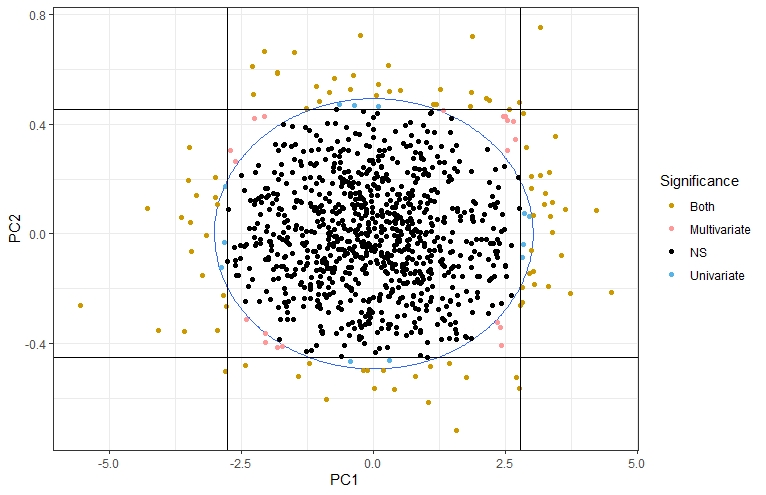 Take 1000 random observations from a bivariate normal distribution where each variable has variance 1 and covariance 0.95. Then, run a PCA for the whole sample and for each observation run a univariate test for each PC and a multivariate test for both variables at the same time. You get four different situations (represented in the figure): a) the observation isn’t significantly different from the rest of the population for any test (in black), b) the observation is significantly different only in its PC1 (in blue, observations off the vertical lines) or PC2 (in blue, observations off the horizontal lines), c) the observation is significantly different only in the multivariate test (in pink, off the blue circle but within the limits of the vertical and horizontal lines), d) significantly different for all tests (in gold, off the circle and the vertical and horizontal lines).