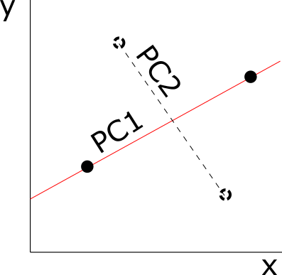 Related to that, using more variables than individuals there will always be a combination of variables separating no matter which group of individuals we’re interested in (a problem leading to overfitting in regression and machine learning techniques): try to describe two people with two parameters (x and y), which can take values either 0 or 1. Only rule: both parameters can’t take the same values for both people (that wouldn’t count as 2 parameters). Spoiler: (at least) one of the parameters will be different for each person (so yes, for 2 individuals in 2D there’s just one PC with all the variance).